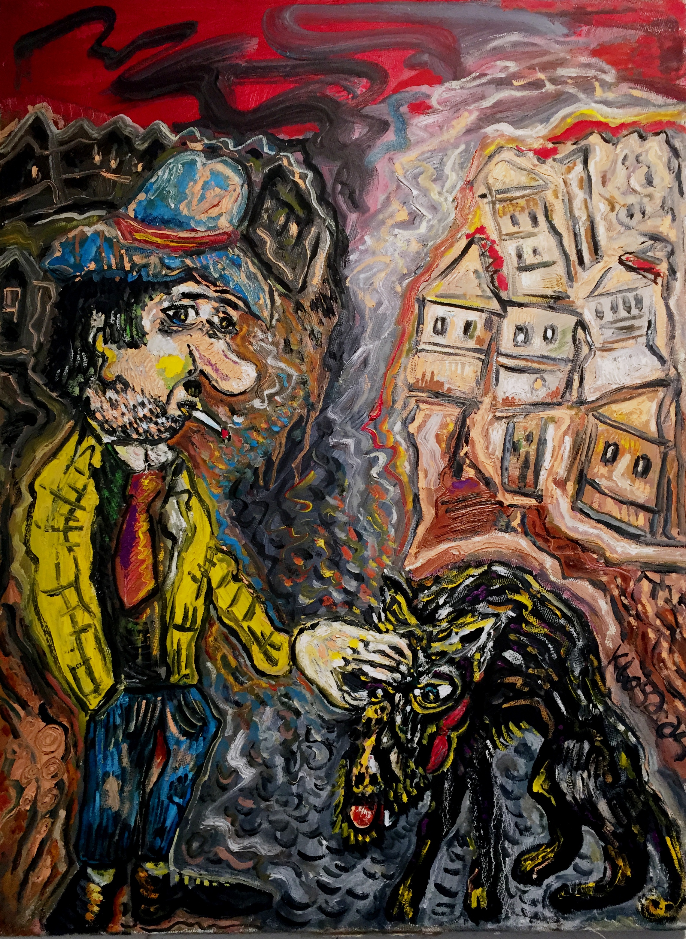 Klošaras “Čarlis ir šuo Džekas” 80×60, drobė, aliejus, 2012m.